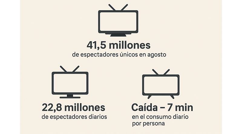 Por su parte, el consumo híbrido –que incluye plataformas de streaming, vídeo bajo demanda, contenidos grabados, videojuegos o radio a través del televisor– registró un promedio de 52 minutos diarios por persona, cinco más que en agosto de 2024 (+11%). En total, el uso combinado del televisor (televisión tradicional más otros consumos audiovisuales) alcanzó los 190 minutos por persona al día (-2%) y 341 minutos por espectador al día (-0,6%).