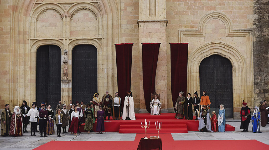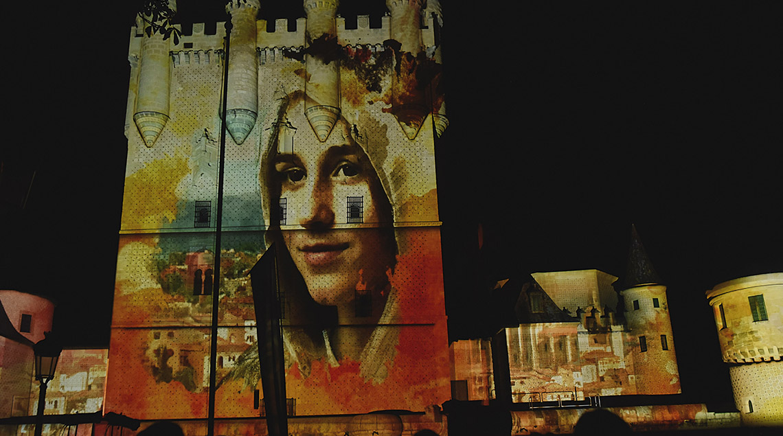 Concebimos la efeméride de la Reina Isabel como una “gran película” donde narrábamos los fastos que se celebraron en su honor en 1474. La iniciamos con un video-mapping en la fachada del Alcázar que dio vida a la historia de Isabel con efectos visuales y actuaciones en vivo. La ceremonia de proclamación contó con un desfile de más de 300 actores, 50 músicos y decenas de nobles a caballo, cetreros con aves rapaces, un coro medieval y toda una población vestida y volcada con la celebración, culminando con una dramatización en la Catedral.