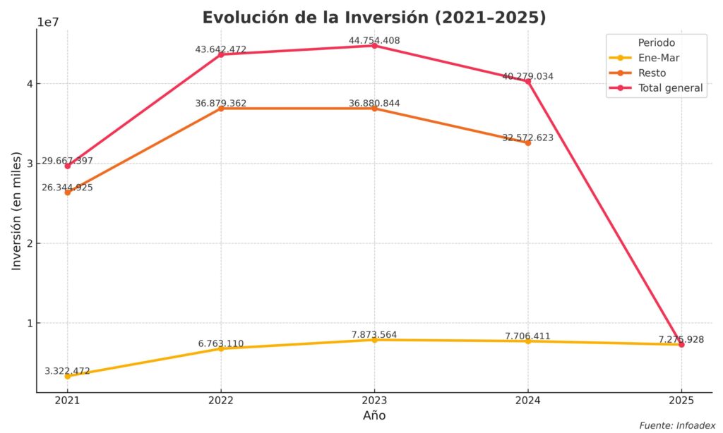 - Relojería: La inversión se mantuvo relativamente estable, con 17,8 millones de euros en 2024 (-2,1 % respecto al año anterior). De enero a marzo de 2025, se registraron 2,5 millones (-5,7 % interanual), apuntando hacia una estabilización con ligeros ajustes.