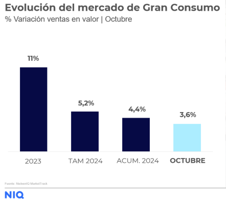 En octubre de 2024, los españoles aumentaron su gasto en la cesta de la compra un 3,6% respecto al mismo mes del año anterior, según los últimos datos publicados por NIQ. Este incremento se produce en un contexto de demanda estancada, que se mantuvo plana en el 0%, mientras que los precios registraron un alza del 3,6%. Este incremento de precios es ligeramente superior al registrado en los últimos meses, lo que refleja una tendencia sostenida de aumento en el coste de los bienes de consumo.
